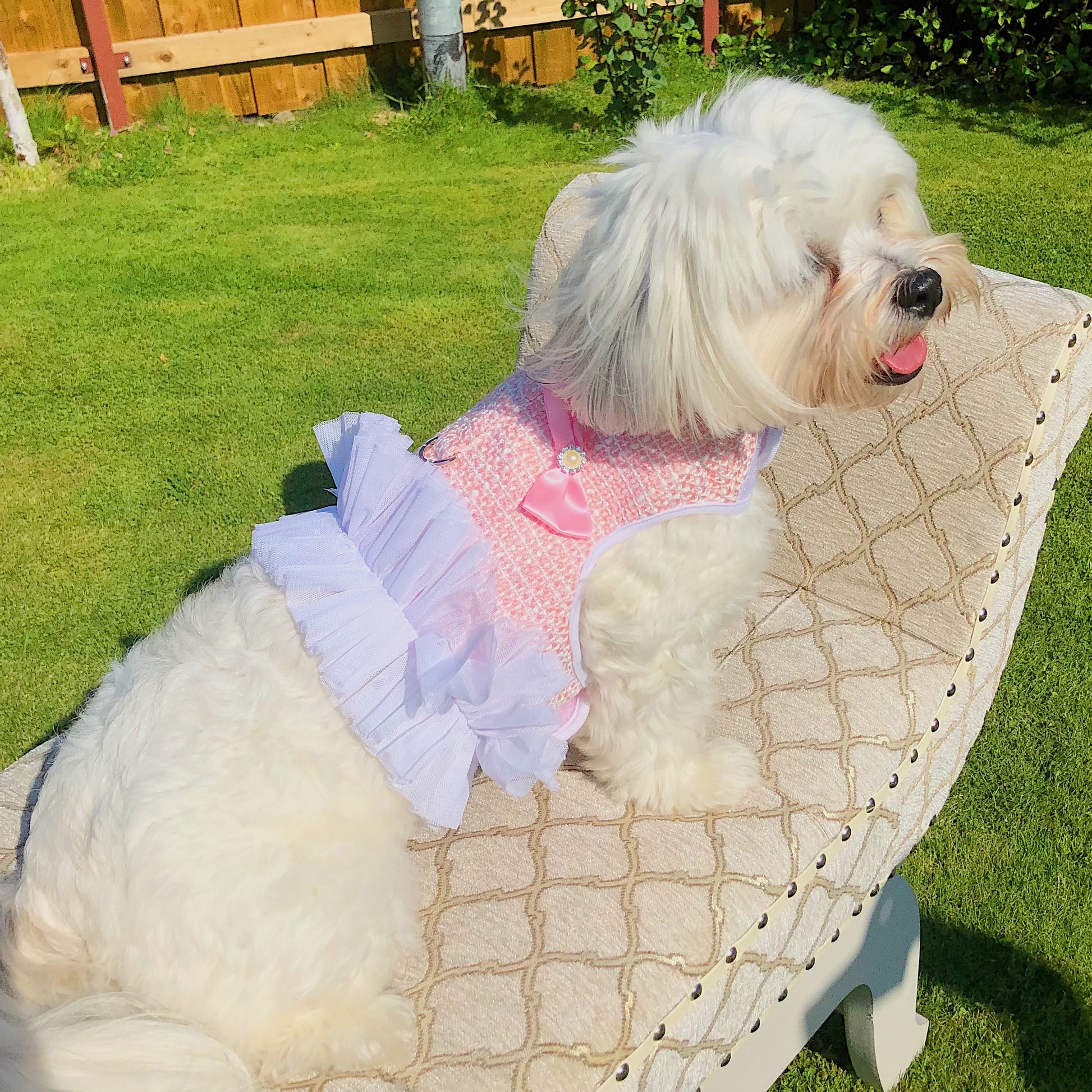 Gorgeous tweed fabric style harness with a mini tutu and a satin bow and crystal bordered pearl embellishment.