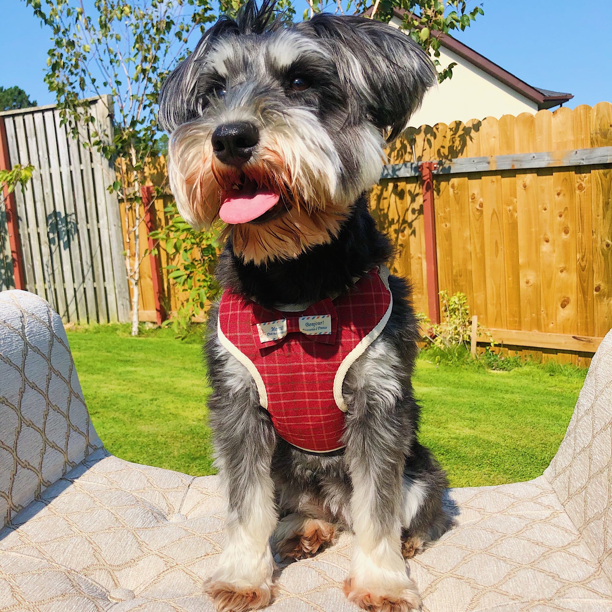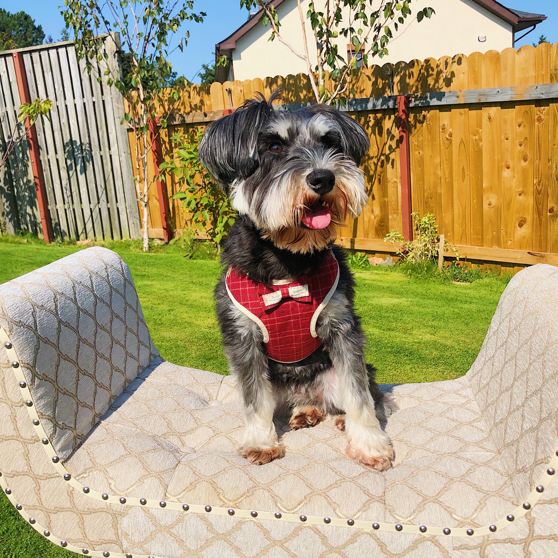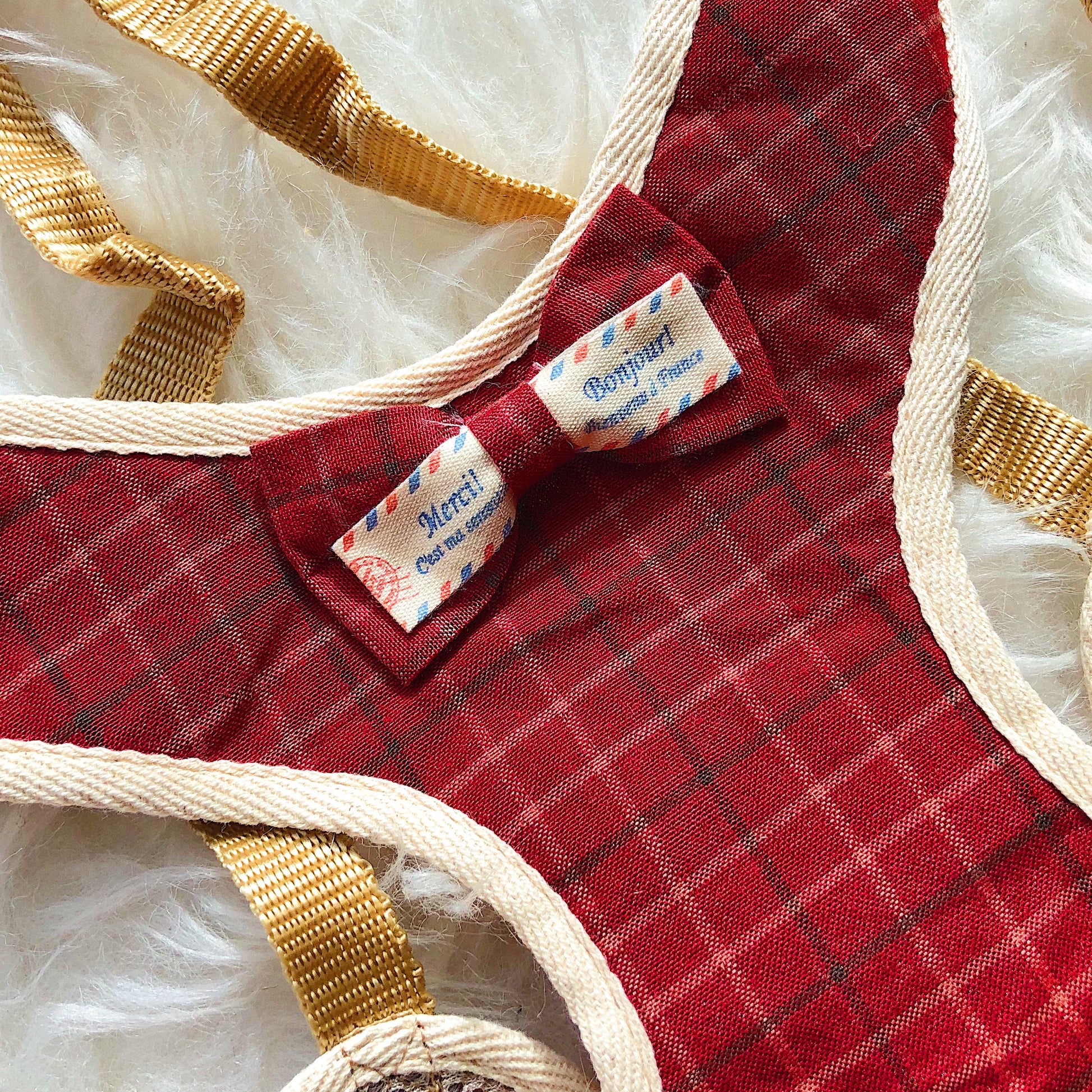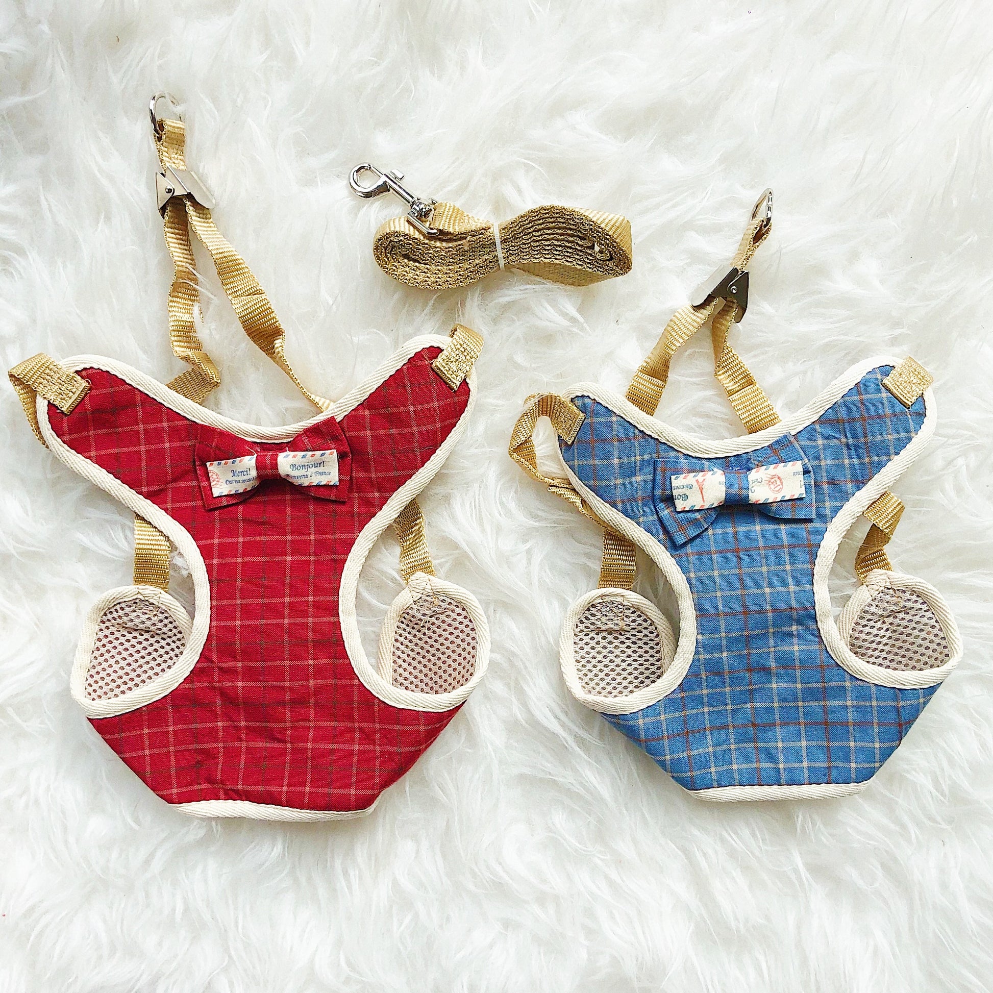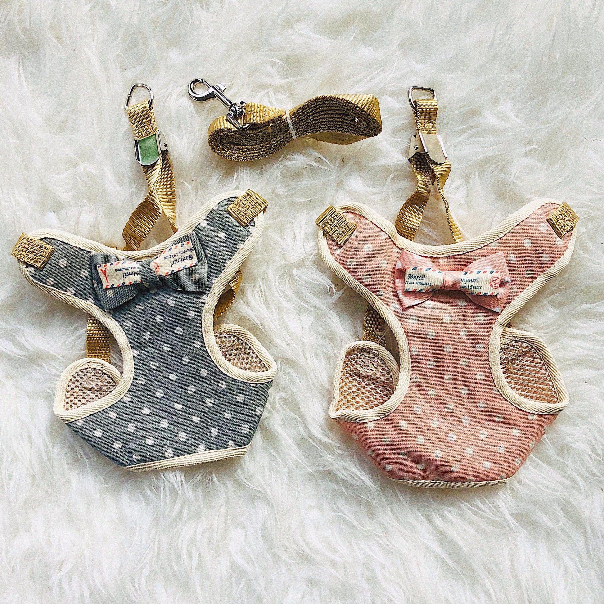 Adorable adjustable padded and patterned walking harness with a bow tie detail. Comes with a matching leash.