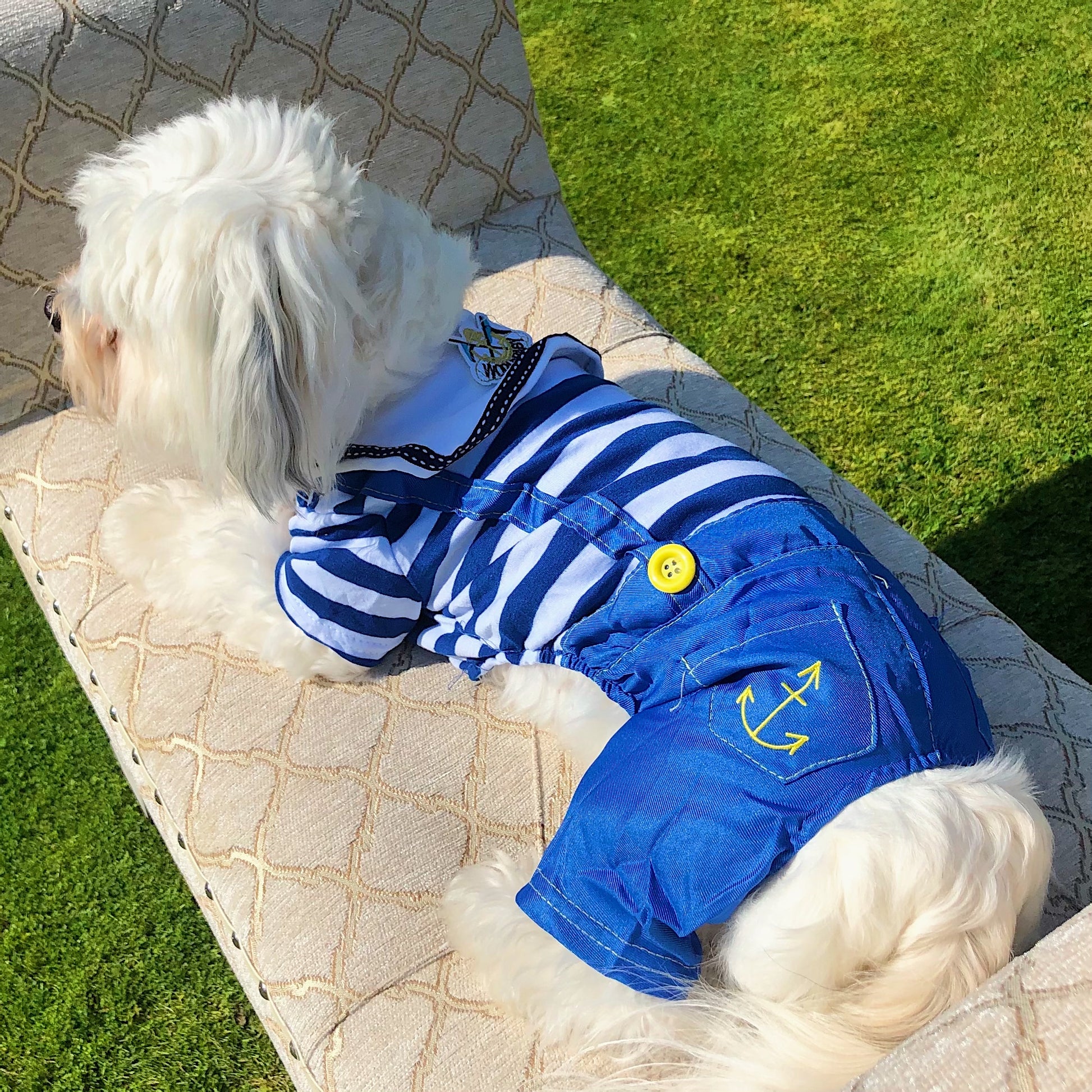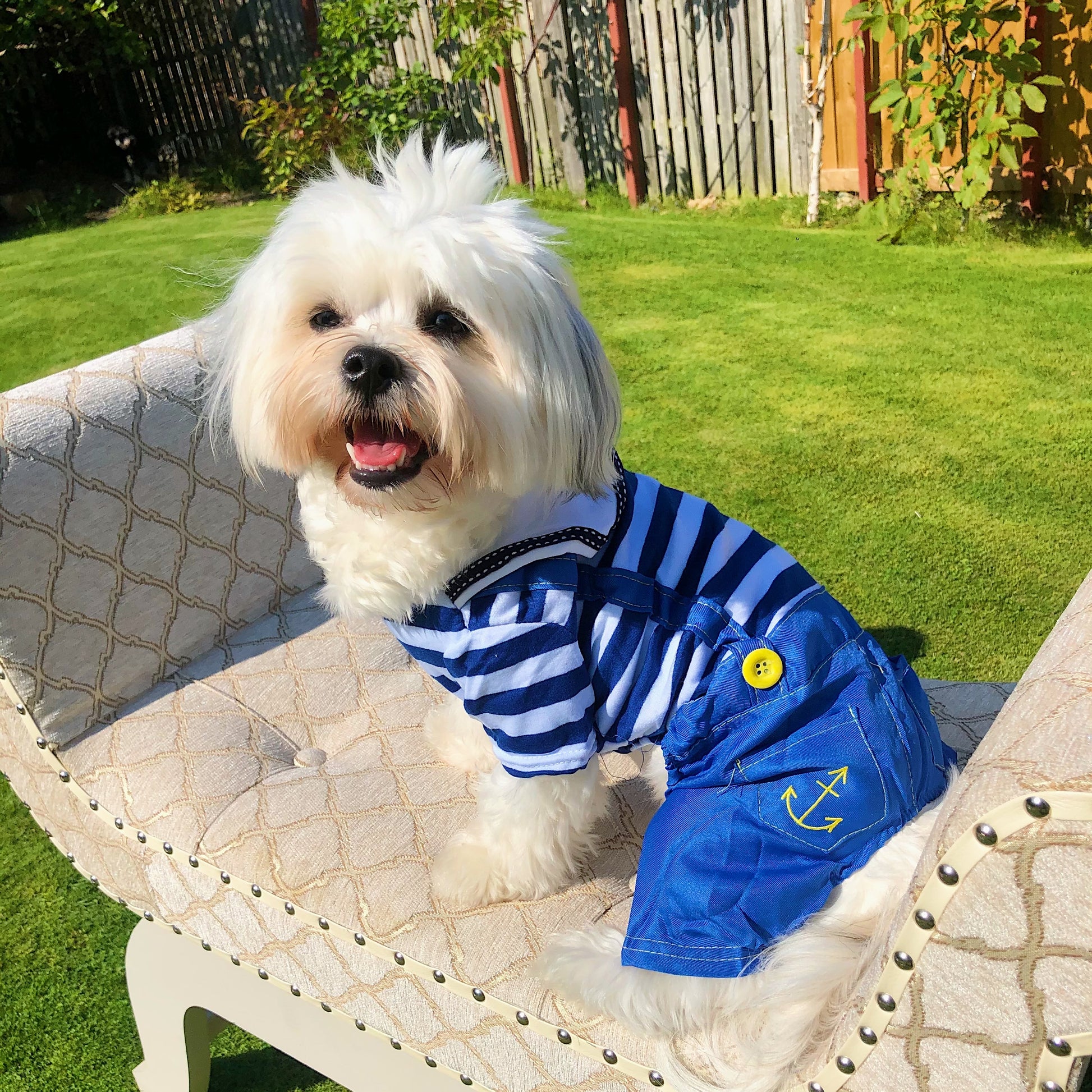 Cheeky dungarees paired with a stripy collared shirt, buttons and sailor inspired embroidery details.